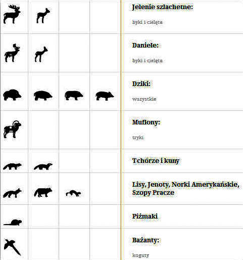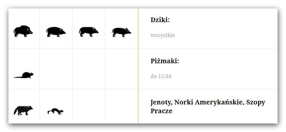 norki amerykańskie, jenoty i szopy pracze; borsuki, tchórze, kuny (leśne i domowe) na terenach obwodów łowieckich na których występuje cietrzew lub głuszec; lisy na terenach obwodów łowieckich, w których występuje głuszec lub cietrzew lub prowadzono w ostatnich 2 latach kalendarzowych zasiedlenia zająca, bażanta lub kuropatwy - przez cały rok; piżmaki na terenach rybackich obrębów hodowlanych; dziki - odyńce, wycinki, przelatki oraz warchlaki, przy czym za warchlaki uznaje się dziki od dnia urodzenia do dnia 31 marca następnego roku kalendarzowego. Inne miesiące kliknij>>>