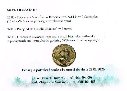 1. Uroczysty Jubileusz 70- lecia koła "Jeleń" w Wołkowyi obchodzony będzie w dniu 7 lutego 2026r i rozpoczniemy Uroczystą mszą w Kościele w Polańczyku o godz. 16,00 , a potem odbędzie się uroczysta Gala w Zajeździe "Karino" w Berezce (rozpoczęcie około godziny 17.15 -tej.)