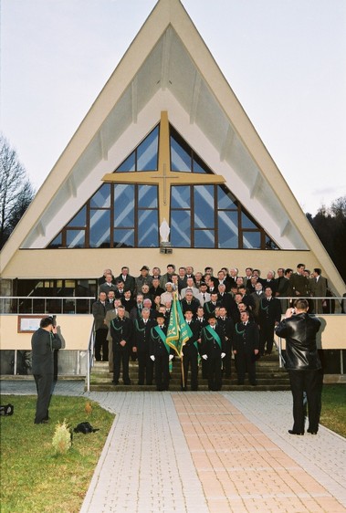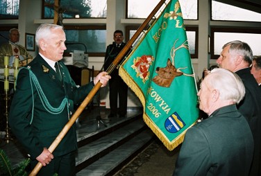 Przed ołtarzem sztandar, w pierwszej ławce Prezes z założycielami Koła, po drugiej stronie chłopcy z pocztu sztandarowego. Pojawiają się księża celebranci i następuje poświęcenie sztandaru, który następnie prezes Okręgowej Rady Łowieckiej wręcza Prezesowi i założycielom Koła. Po oddaniu honorów sztandarowi i zaprezentowaniu go obecnym w kościele sztandar zostaje przekazany pocztowi sztandarowemu. Naprawdę bardzo podniosła uroczystość, piękna oprawa i wzruszająca, choć nie krótka homilia księdza Szczepańskiego.
