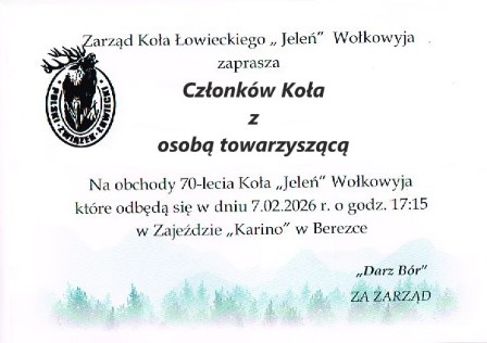 1. Uroczysty Jubileusz 70- lecia koła "Jeleń" w Wołkowyi obchodzony będzie w dniu 7 lutego 2026r i rozpoczniemy Uroczystą mszą w Kościele w Polańczyku o godz. 16,00 , a potem odbędzie się uroczysta Gala w Zajeździe "Karino" w Berezce (rozpoczęcie około godziny 17.15 -tej.)